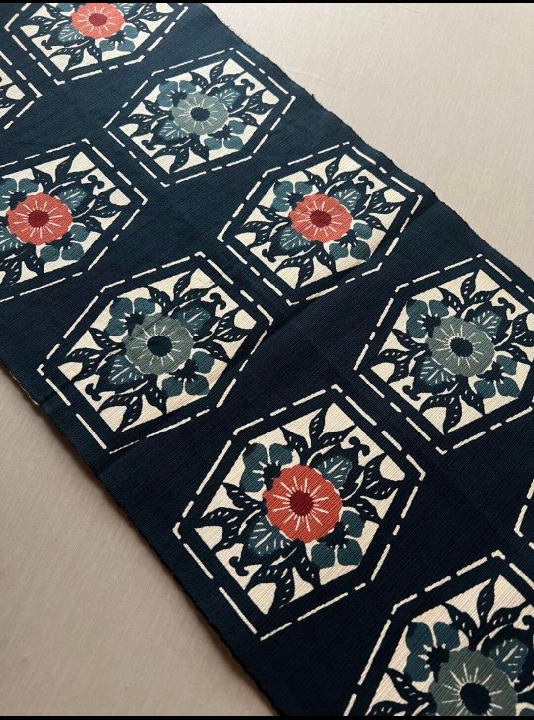 藍色の型染めで、抽象的な花模様です。