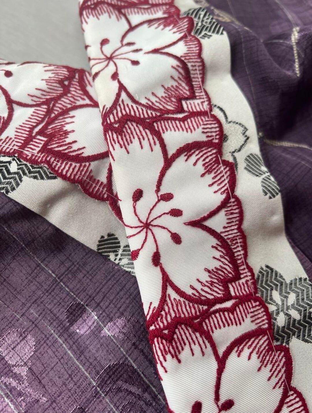 見えないところのお洒落ですが、裾や振りからチラッと見える紫が可愛らしいです。