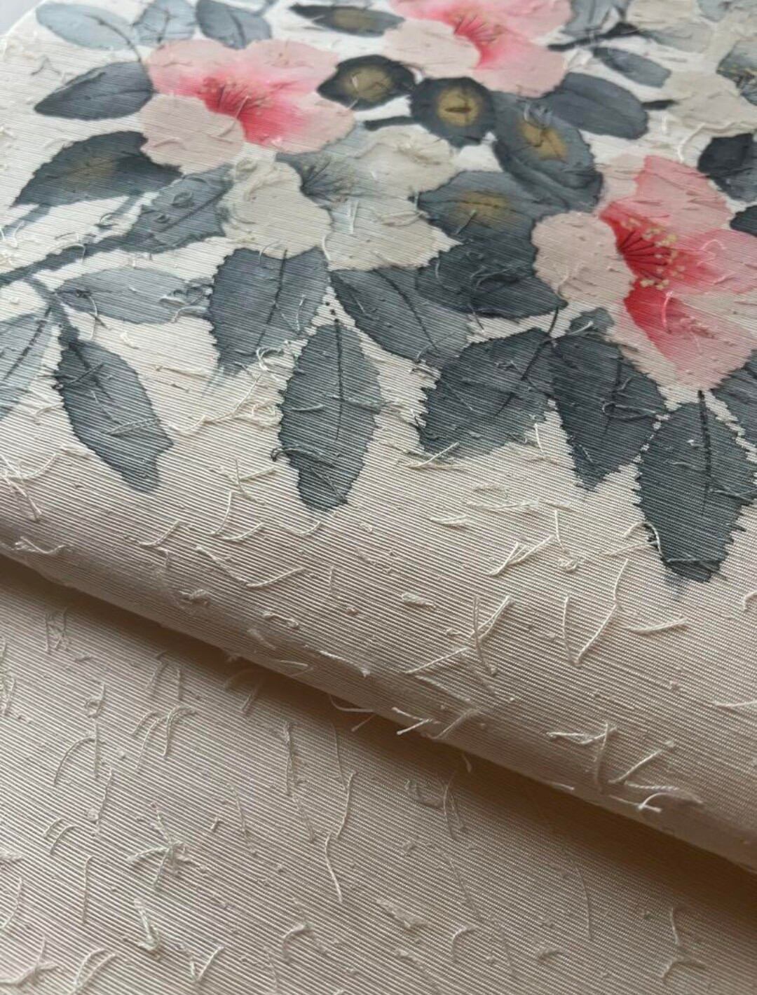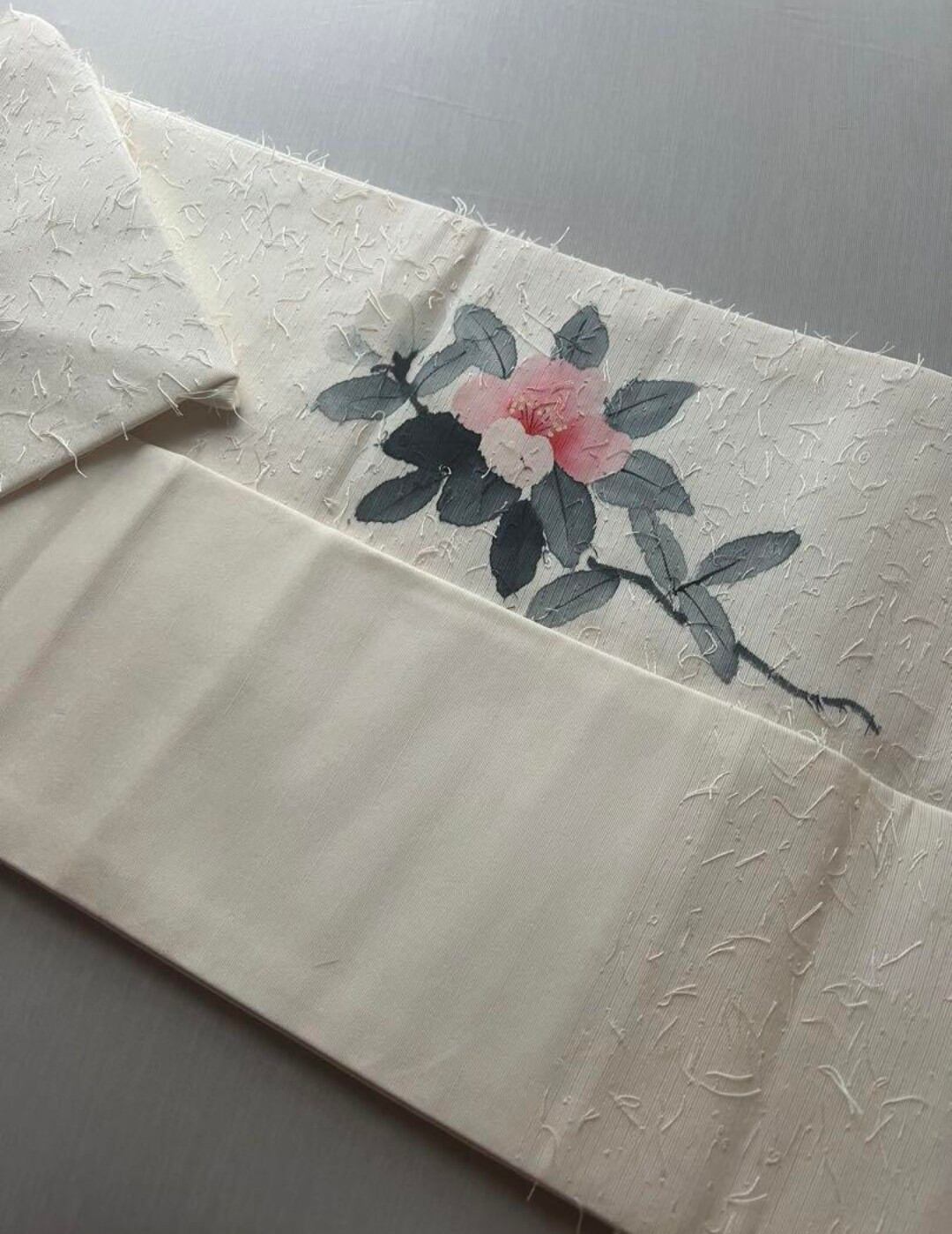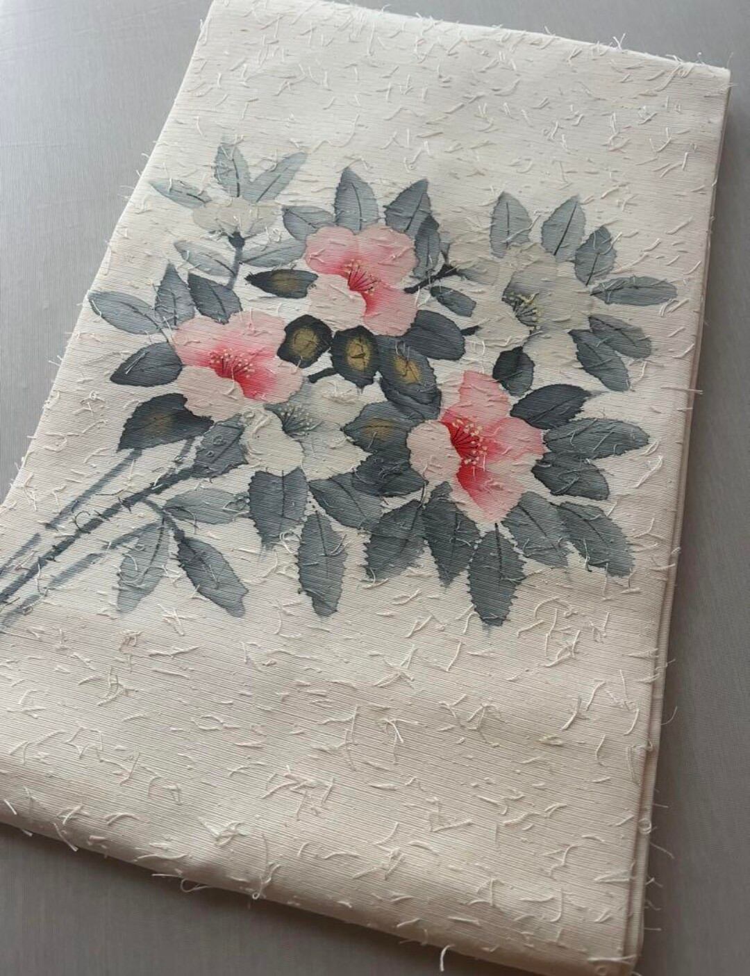 糸が飛び出したようなユニークな生地が特徴のひげ紬の帯です。