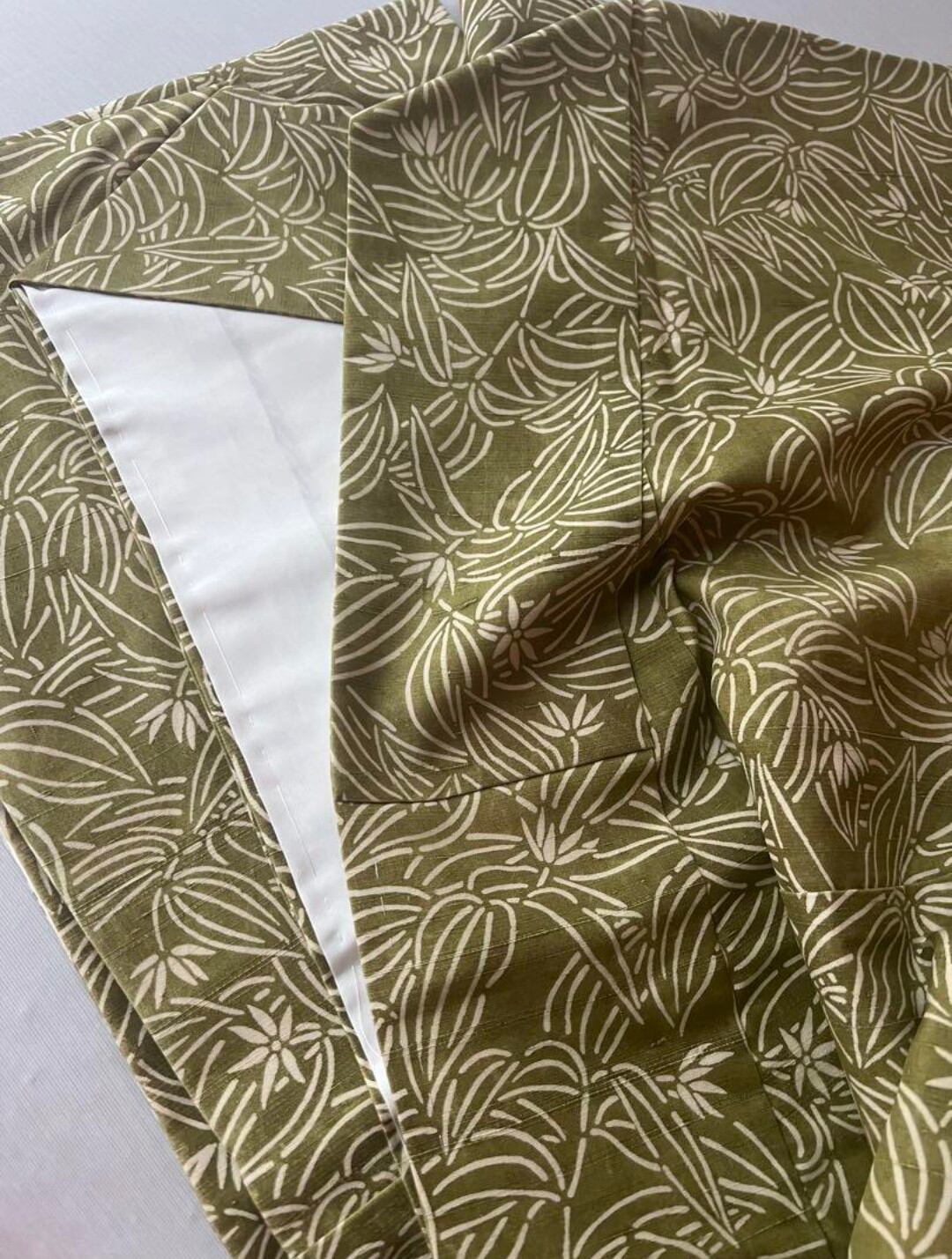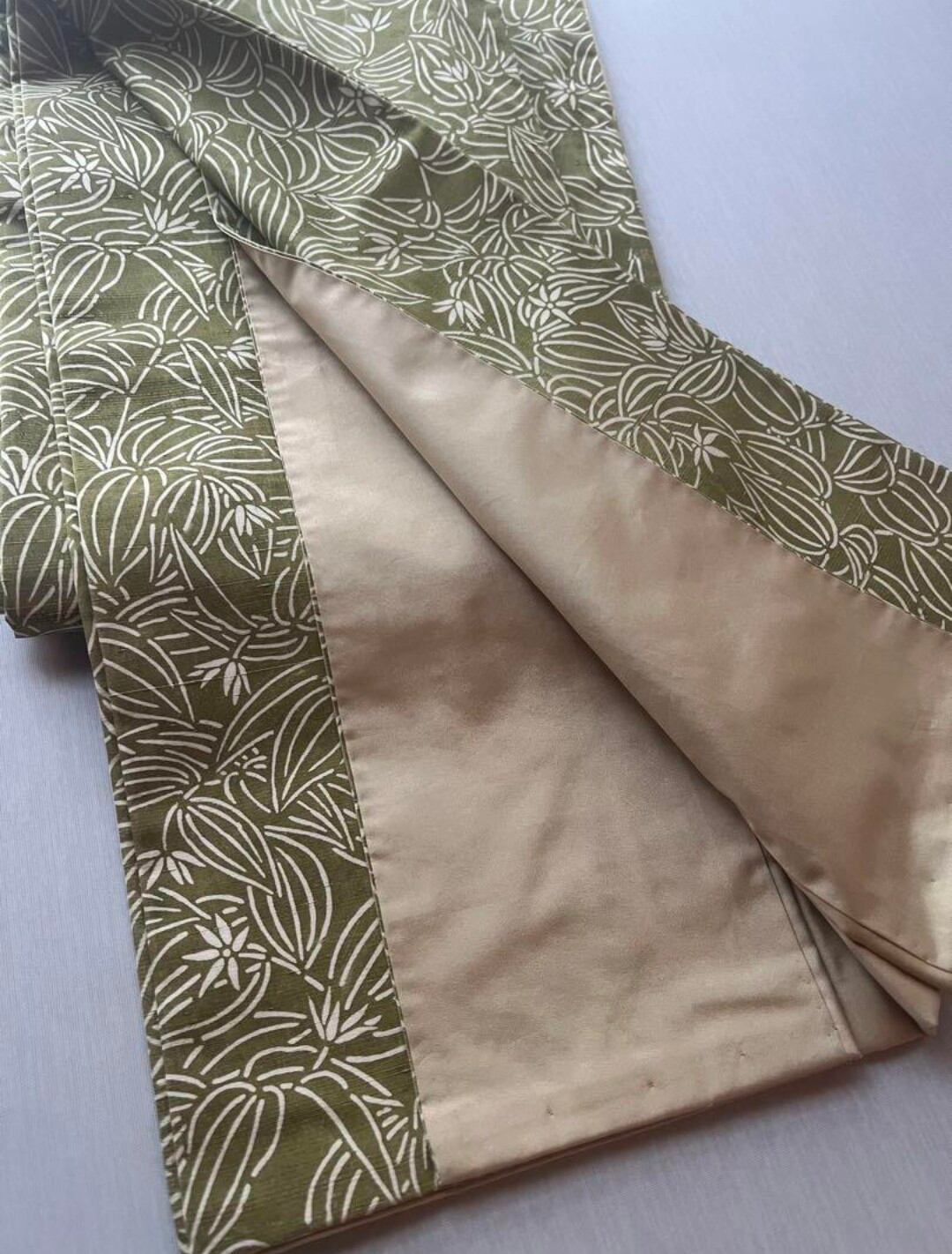 柔らかい黄緑に、型染めのようなリーフ(葉)模様です。