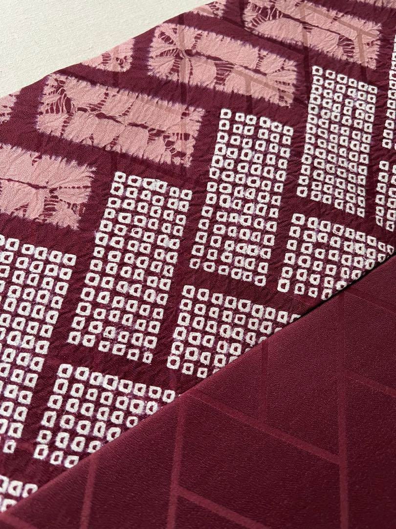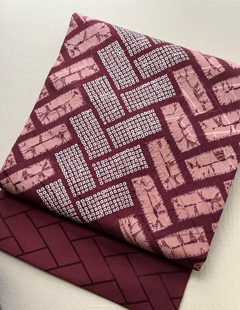 紫に檜垣模様の絞りで、絞りの種類も変えており、紋様の遊び心ある面白い帯です。