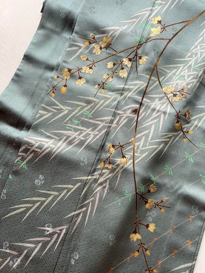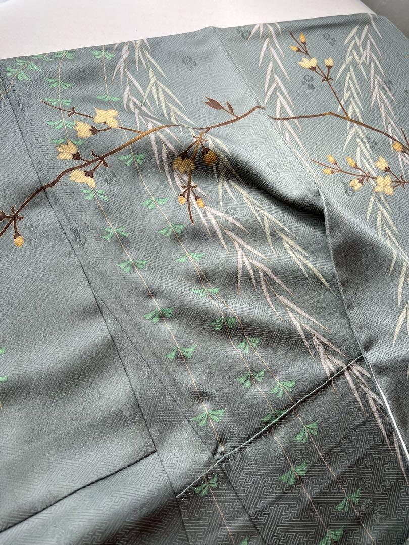 流れるような柳と花の柄で、上前の花部分には刺繍が施された、落ち着いた色ながら大変豪華な訪問着です。