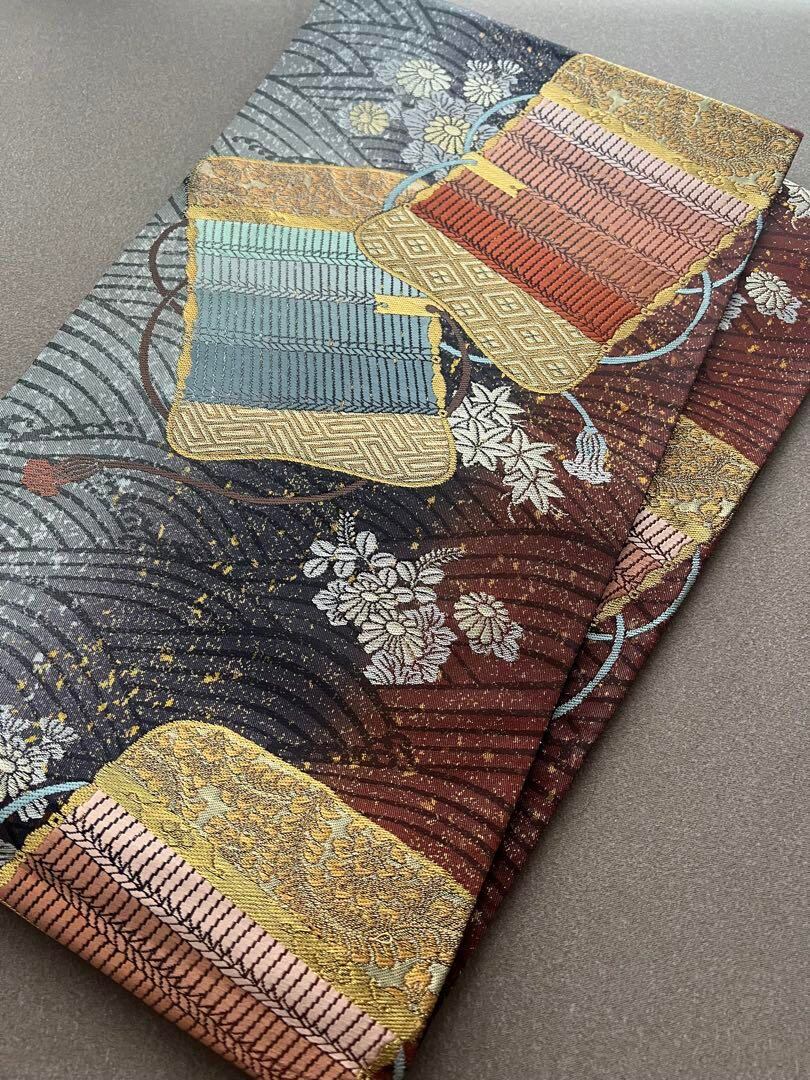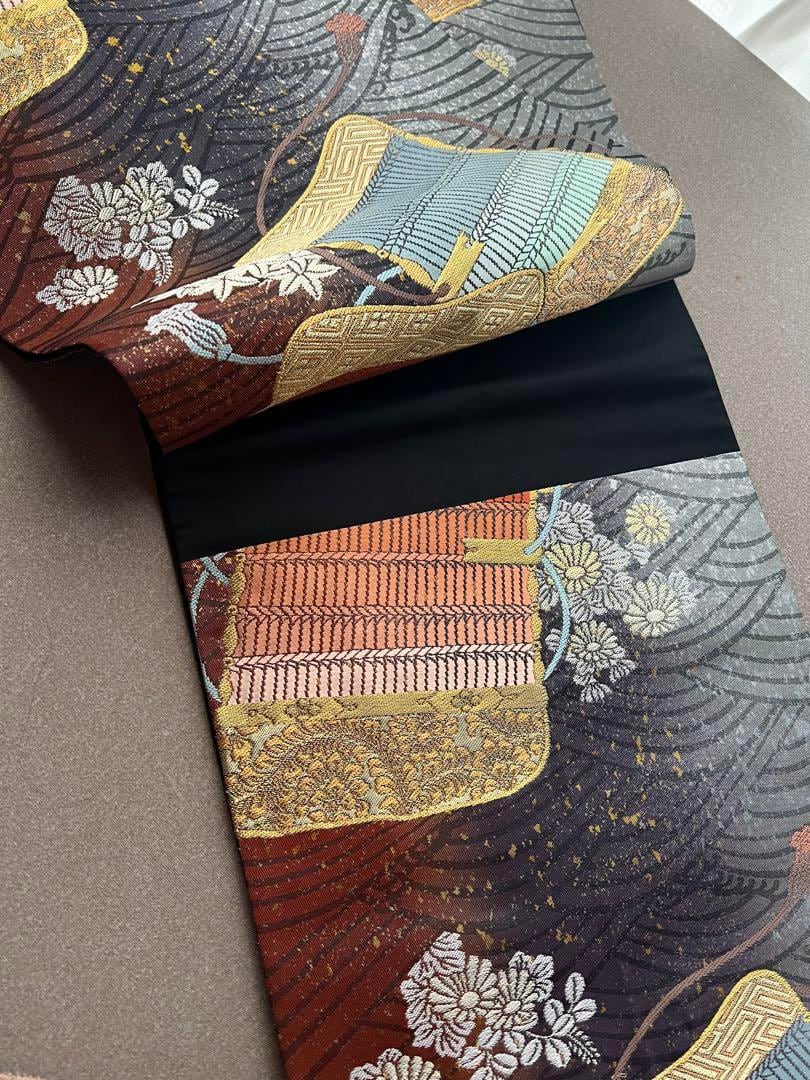 鎧のような柄がカッコよく締まる、鎧縅紋様の帯です。