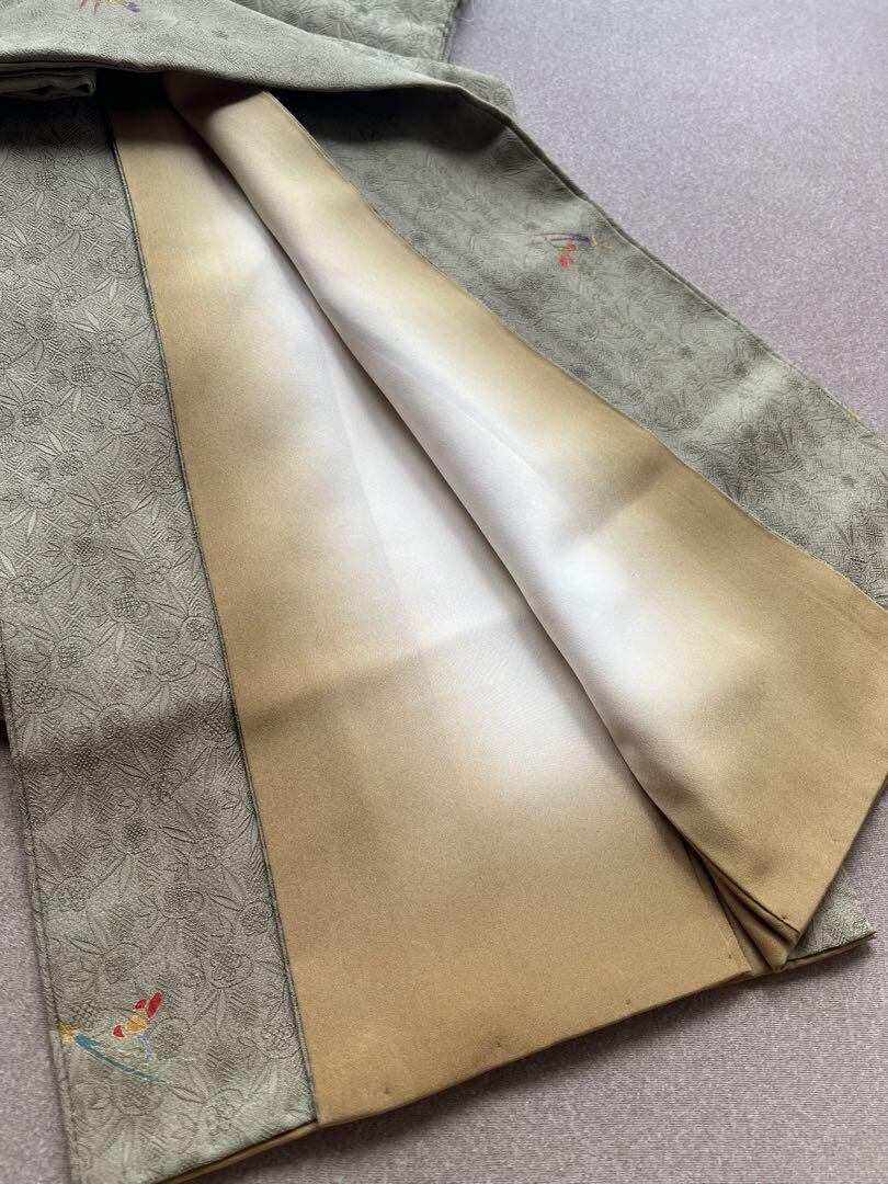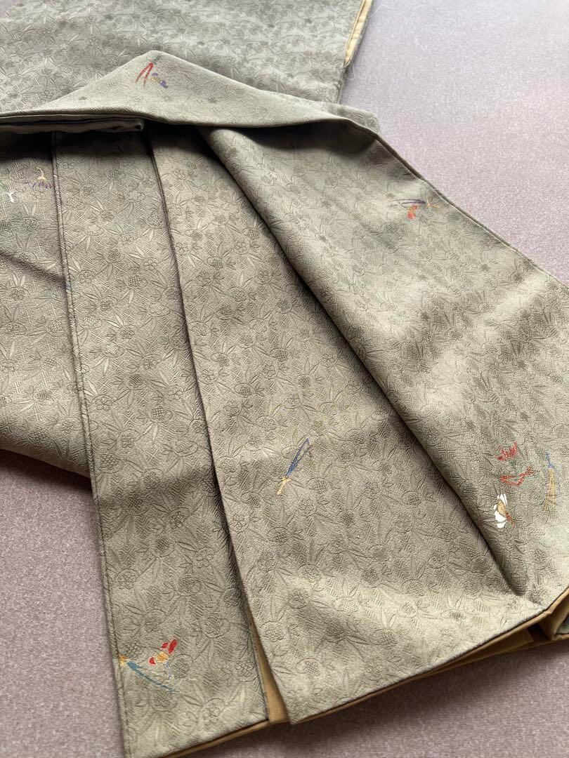 抹茶色に飛び柄で松葉や花が描かれています。