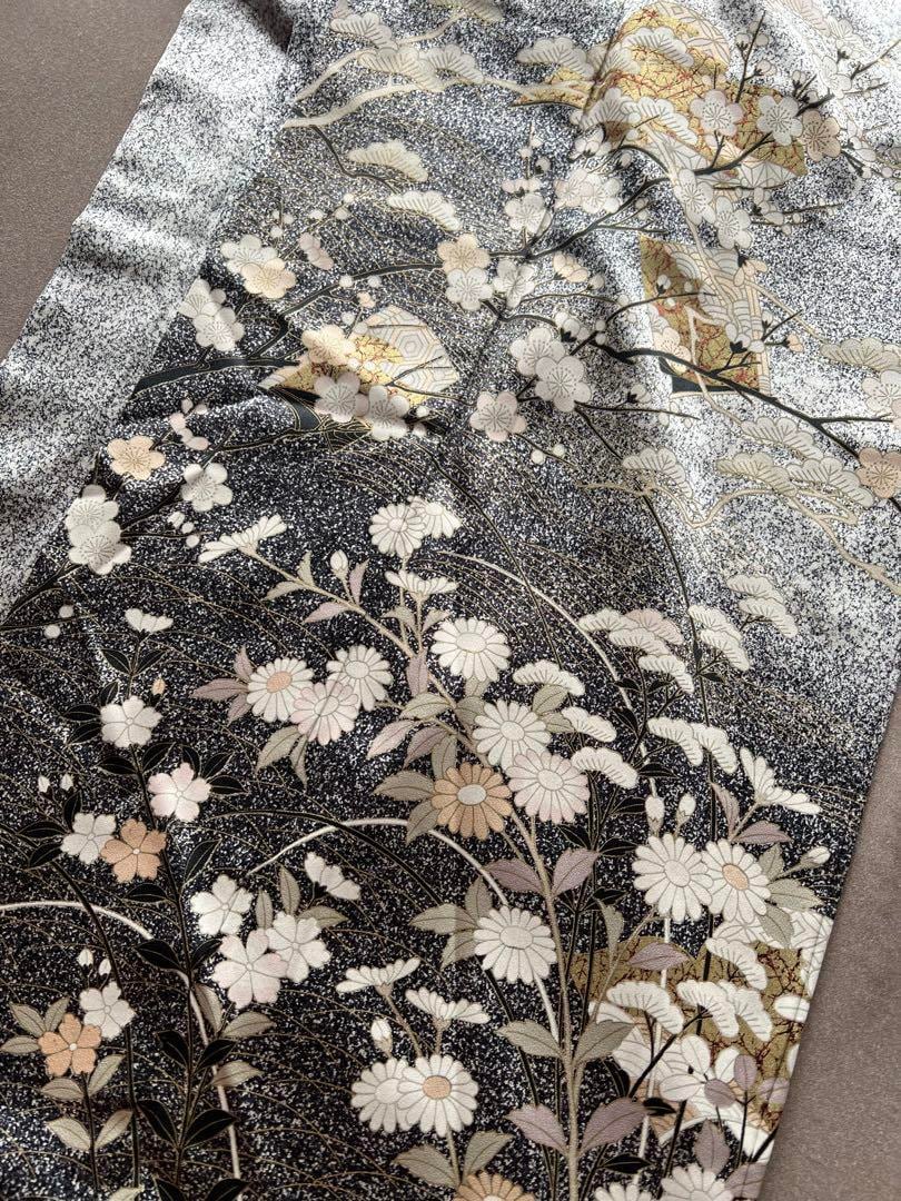 モノトーンのようなシックな地色に、梅や菊などの四季の花が描かれた訪問着になります。