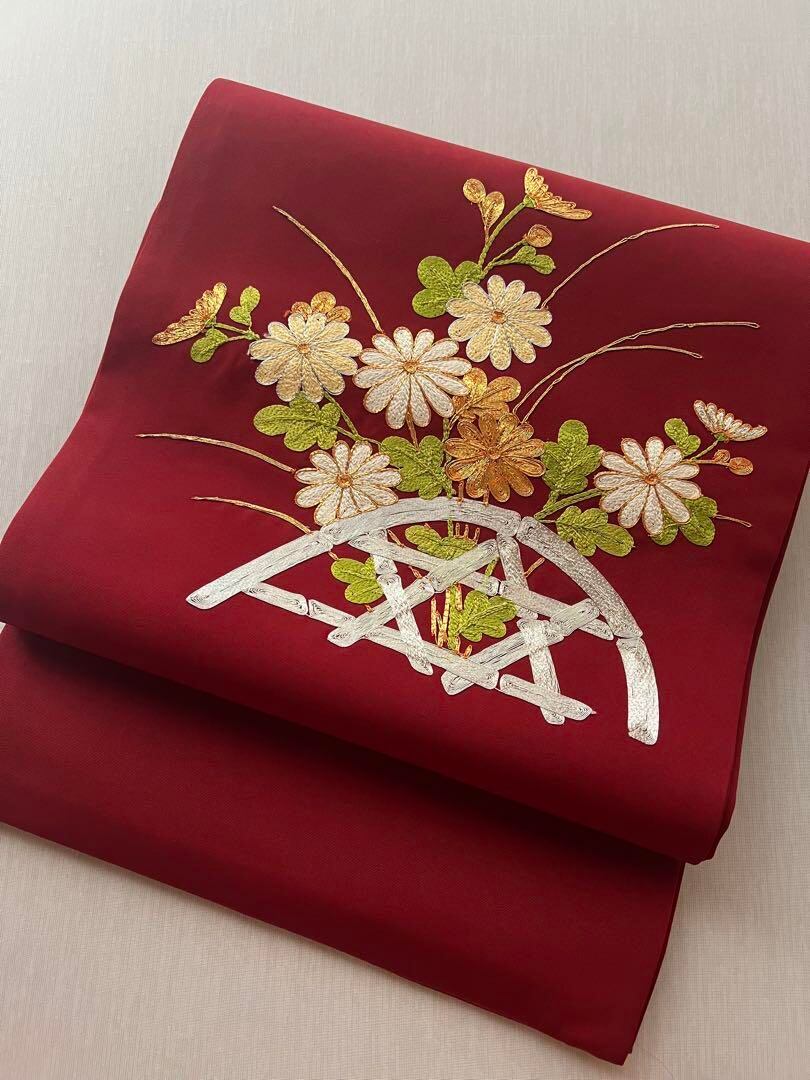 塩瀬の生地に刺繍が施された名古屋帯です。
