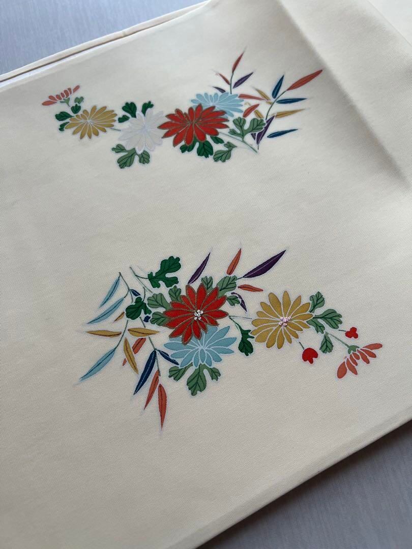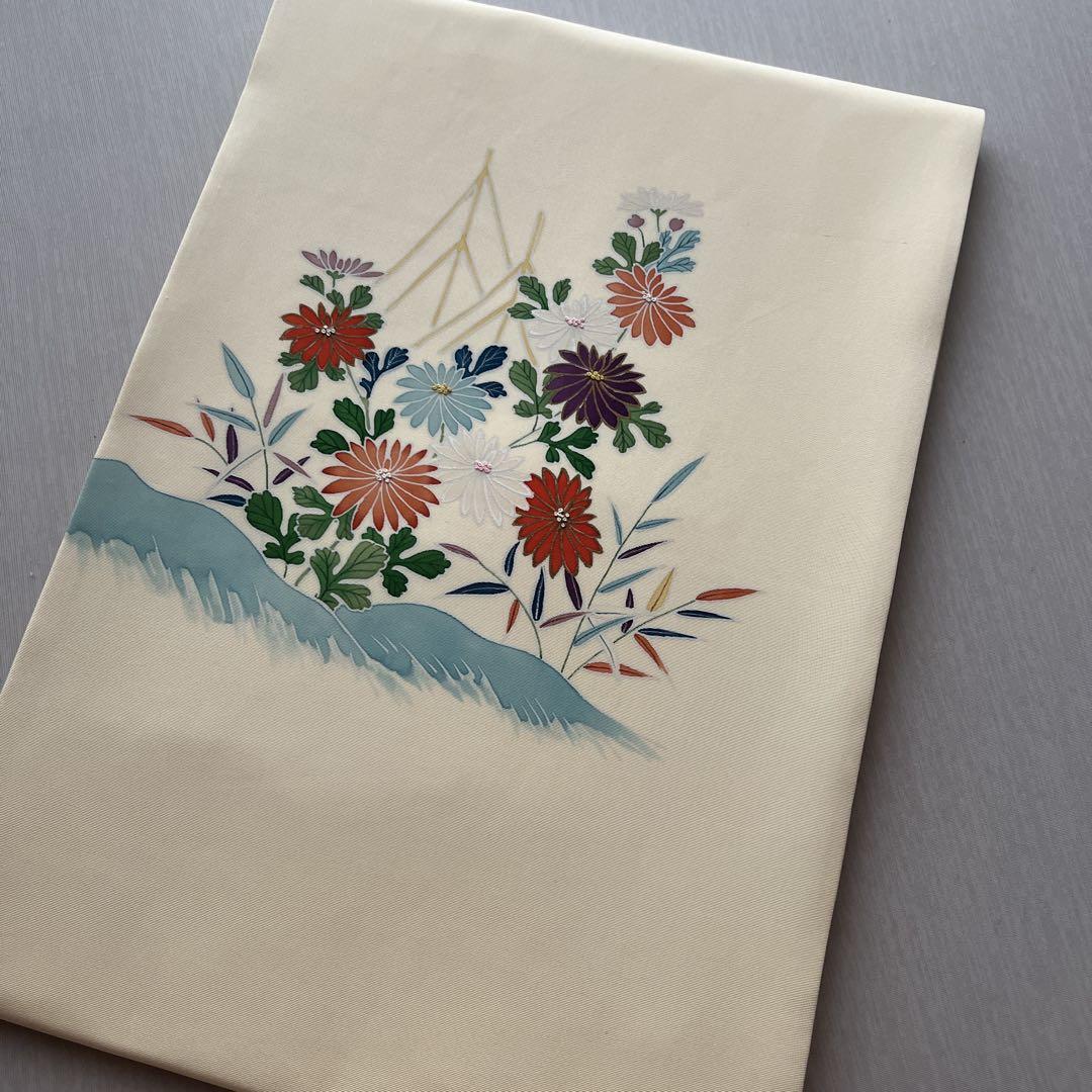 合わせやすいクリーム色に、色合いの良い菊柄、御所解のような雰囲気の帯になります。