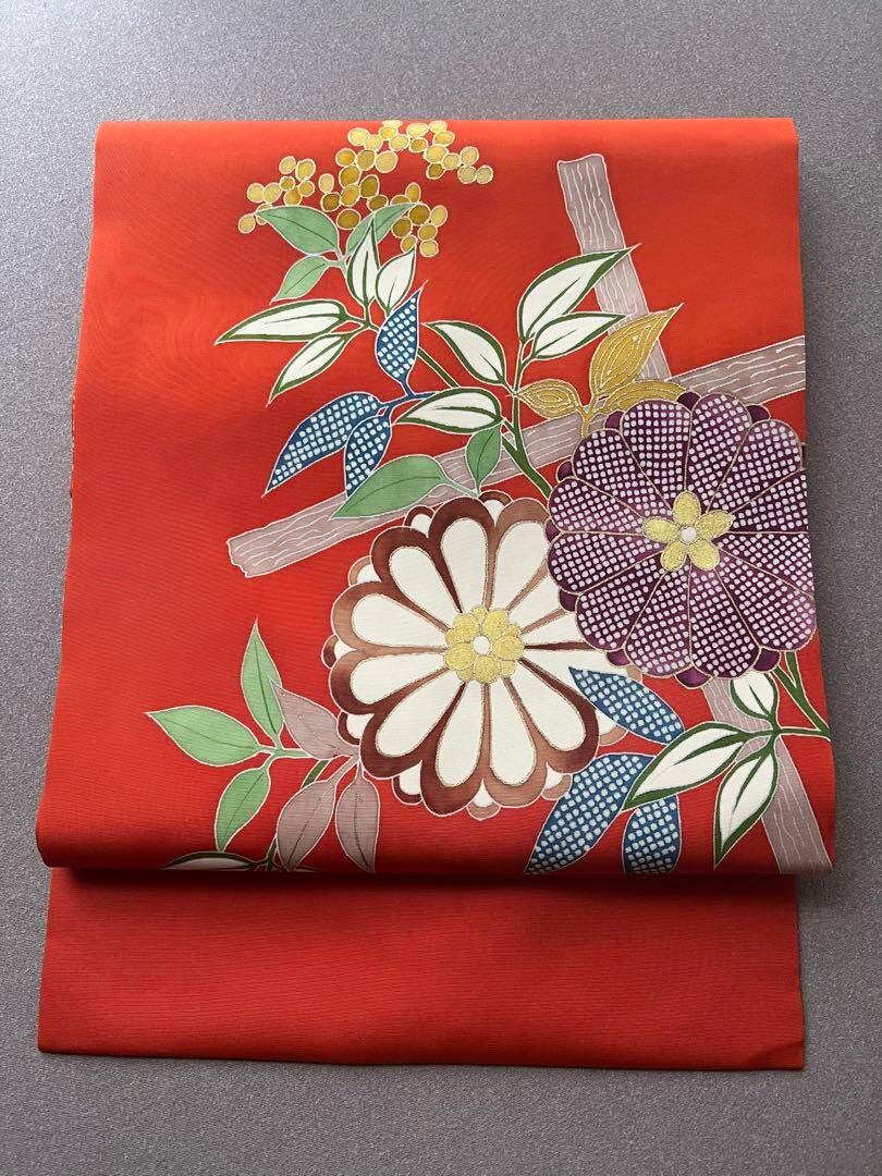 塩瀬 名古屋帯 オレンジ 菊 南天