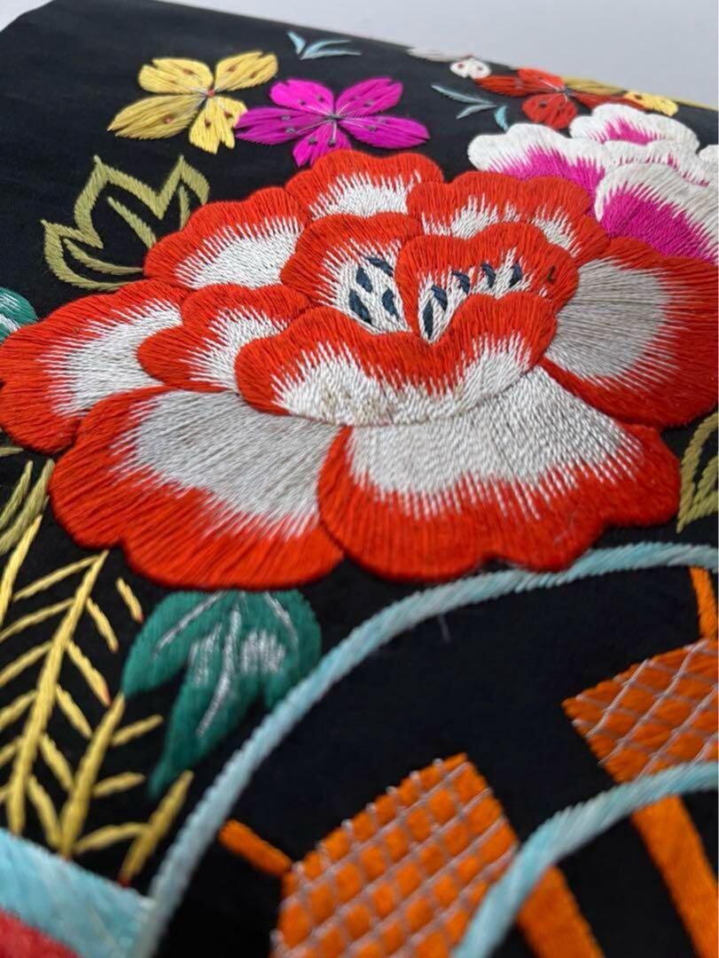 名古屋帯 アンティーク帯 黒地 刺繍 花