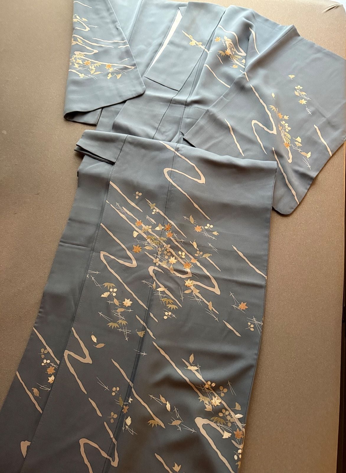 着物 袷 付下げ 吹き寄せ 水色 一つ紋