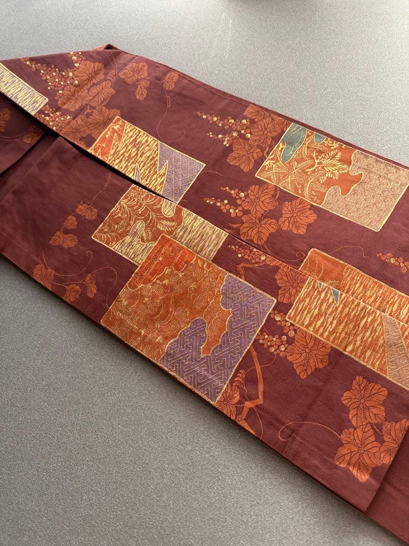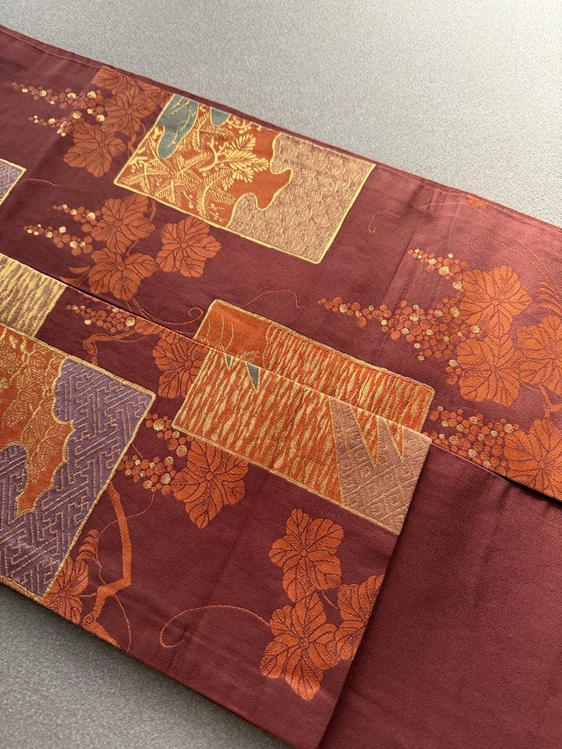 柄は葡萄や草花で、落ち着いた雰囲気の帯です。