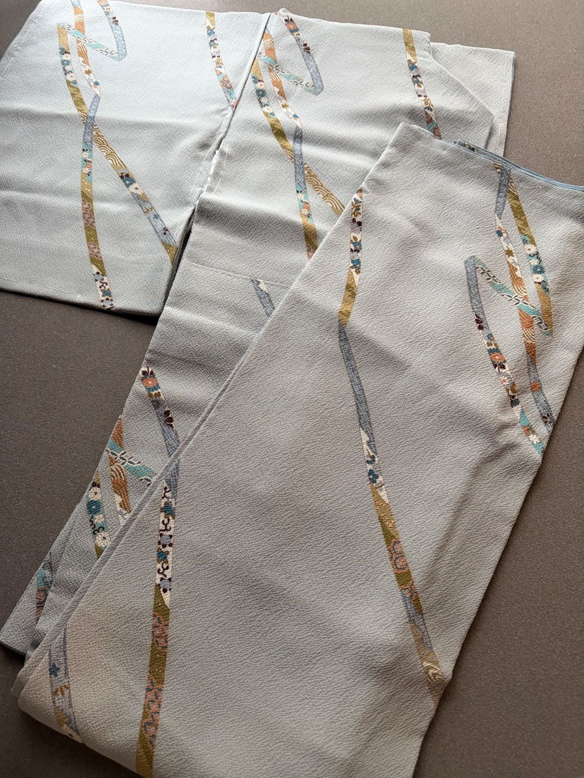 くすみ系の水色にかづら帯と言う柄の着物です。