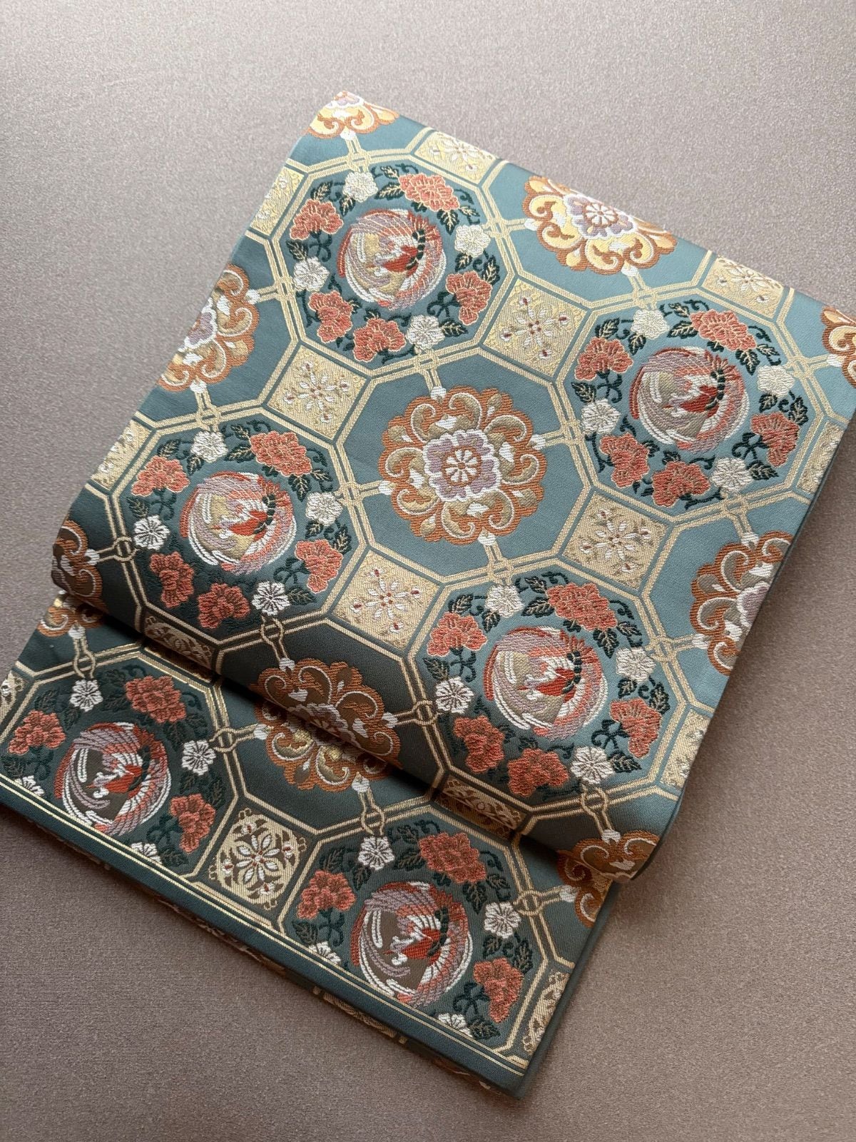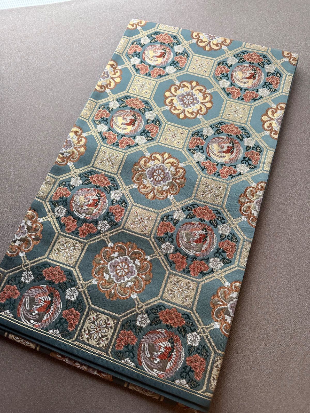 ブルーグレーの上品な色合いに蜀江紋様と花鳥模様で高貴な雰囲気の帯です。