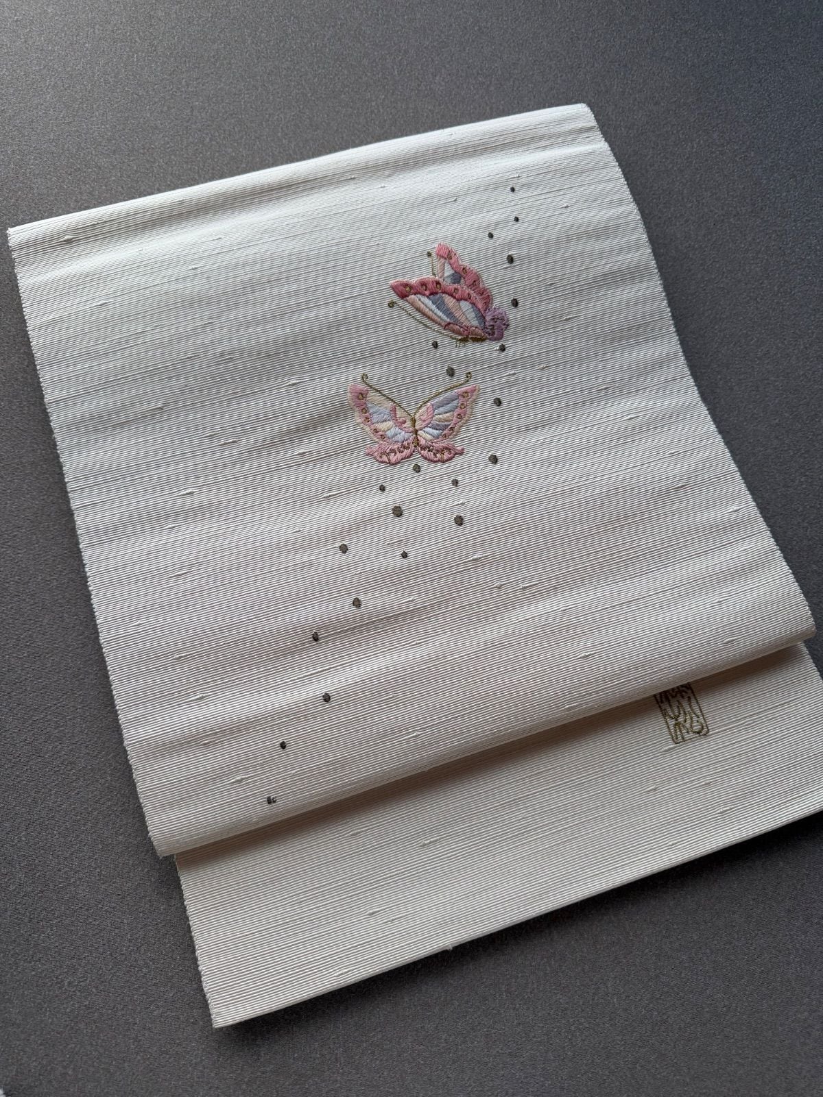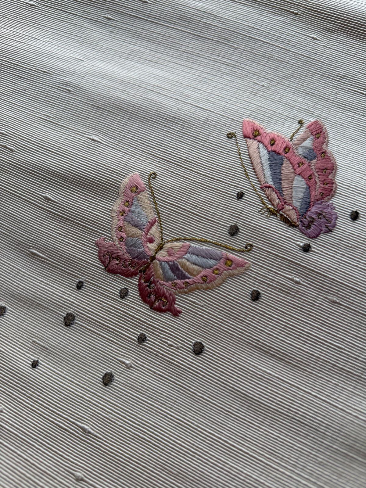 クリーム地に蝶々の刺繍が可愛い帯になります。