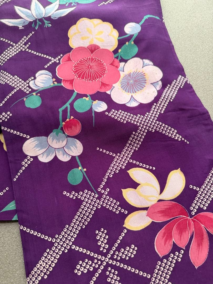 濃い紫に椿と梅の花柄のアンティーク着物です。