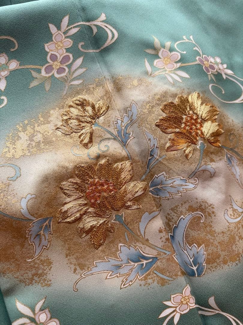 青磁色に花紋様の華やかな着物です。