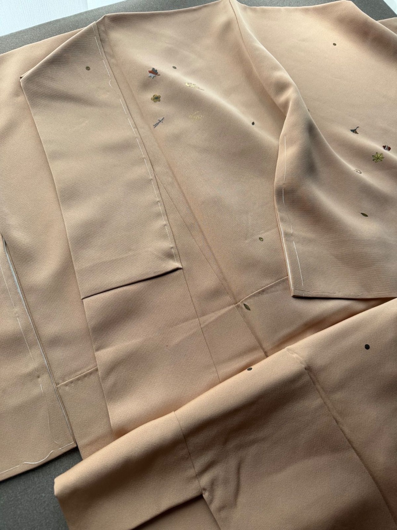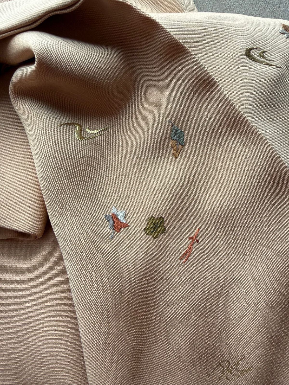 着物 付下げ 未使用 ベージュ 吹き寄せ 紋付き