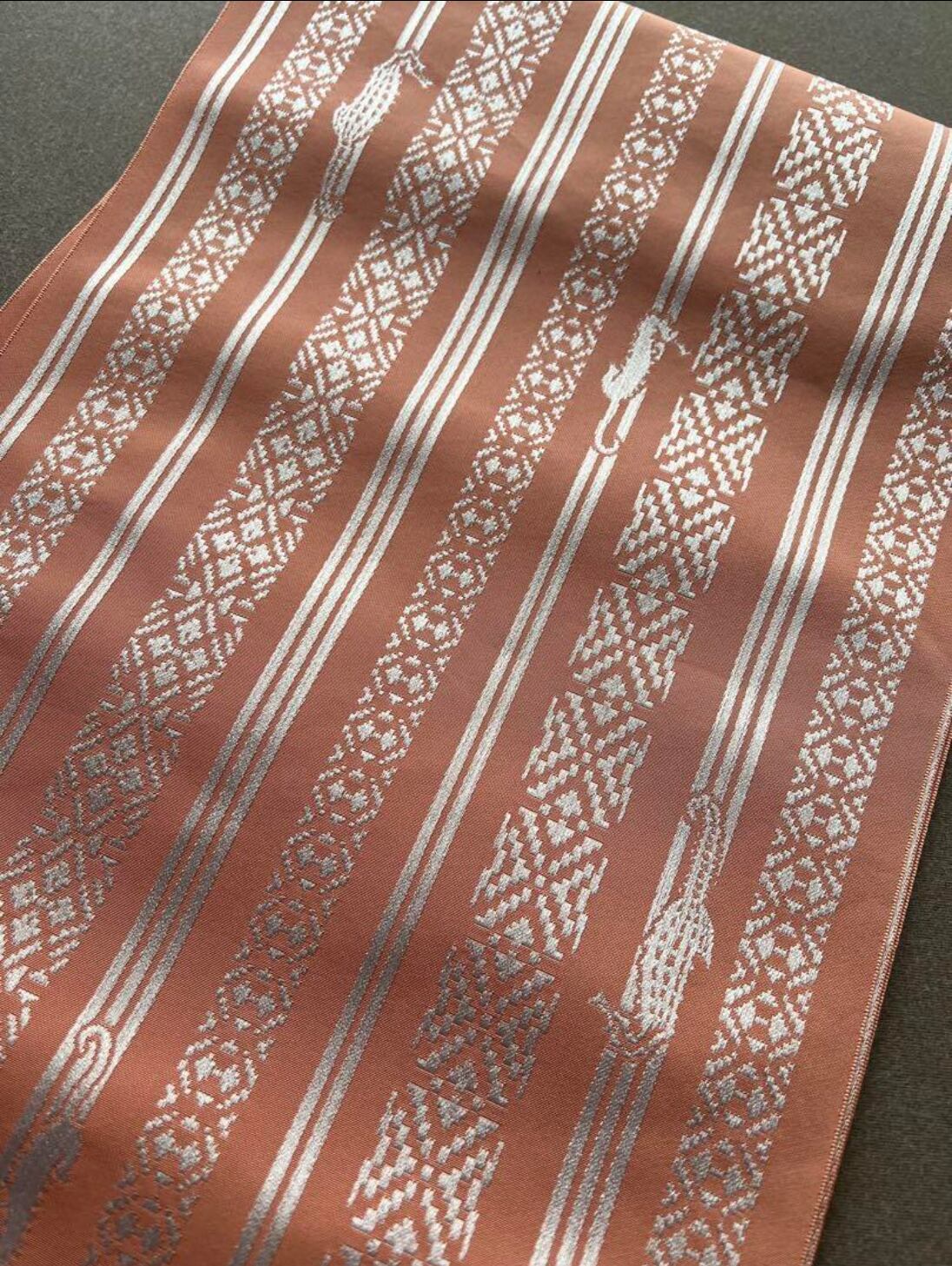 一見普通の博多献上のように見えますが、よく見るとタツノオトシゴ柄で、とても珍しく可愛い帯です。